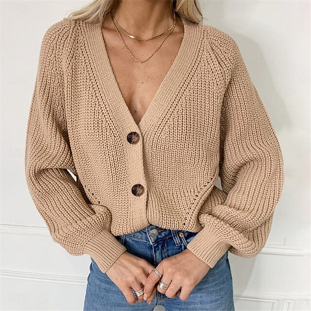 Women's Sweater Cardigan Casual smooth Pure Color Ribbed V Neck Buttons Knitted Long Sleeve Regular Tops Knit Outdoor Daily Weekend Black Khaki Fall Winter